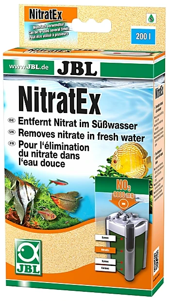 JBL NitratEX reduces unacceptably high nitrate levels trough ion exchange. 250 ml JBL NitratEX absorb up to 9000 mg nitrate within a few hours. That approximately corresponds to a 200 l aquarium (minus decoration etc. approx. 180 l) with 50 mg nitrate/l. When the capacity has been exhausted, none of the nitrate is released back into the water. Simply regenerate JBL NitratEX with salt without iodine and it is ready to be used once again.